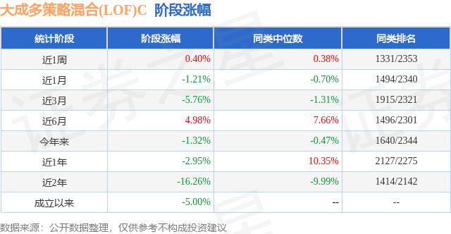 从业绩表现来看,大成多策略混合(LOF)C基金过去一年净值涨幅为19.79%,在同类基金中排名1459/2296,同类基金过去一年净值涨幅中位数为29.9%。而基金过去一年的最大回撤为-7.76%,成立以来的最大回撤为-26.62%。