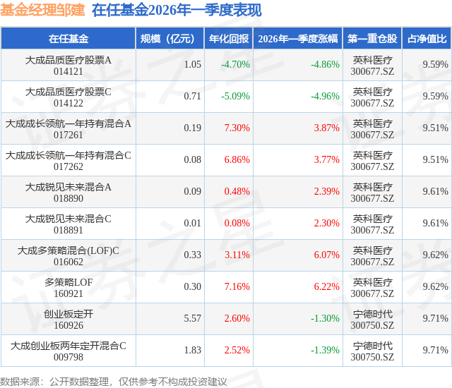 从基金规模来看,大成多策略混合(LOF)C基金2026年一季度公布的基金规模为0.33亿元,较上一期规模2.34亿元变化了-2.01亿元,环比变化了-86.02%。该基金最新一期资产配置为:股票占净值比84.02%,无债券类资产,现金占净值比12.56%。从基金持仓来看,该基金当季前十大股票仓位达53.69%,第一大重仓股为英科医疗(300677),持仓占比为9.62%。