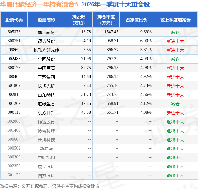 从基金规模来看,华夏低碳经济一年持有混合A基金2026年一季度公布的基金规模为1.17亿元,较上一期规模1.28亿元变化了-1145.84万元,环比变化了-8.92%。该基金最新一期资产配置为:股票占净值比83.63%,无债券类资产,现金占净值比14.98%。从基金持仓来看,该基金当季前十大股票仓位达53.78%,第一大重仓股为博迁新材(605376),持仓占比为9.69%。