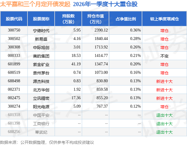 从基金规模来看,太平嘉和三个月定开债发起基金2026年一季度公布的基金规模为66.11亿元,较上一期规模47.74亿元变化了18.37亿元,环比变化了38.48%。该基金最新一期资产配置为:股票占净值比15.74%,债券占净值比93.89%,现金占净值比0.92%。从基金持仓来看,该基金当季前十大股票仓位达1.98%,第一大重仓股为宁德时代(300750),持仓占比为0.36%。