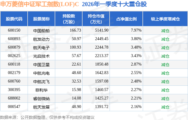 从基金规模来看,申万菱信中证军工指数(LOF)C基金2026年一季度公布的基金规模为0.19亿元,较上一期规模2432.02万元变化了-554.07万元,环比变化了-22.78%。该基金最新一期资产配置为:股票占净值比93.97%,无债券类资产,现金占净值比6.11%。从基金持仓来看,该基金当季前十大股票仓位达33.22%,第一大重仓股为中国船舶(600150),持仓占比为7.97%。