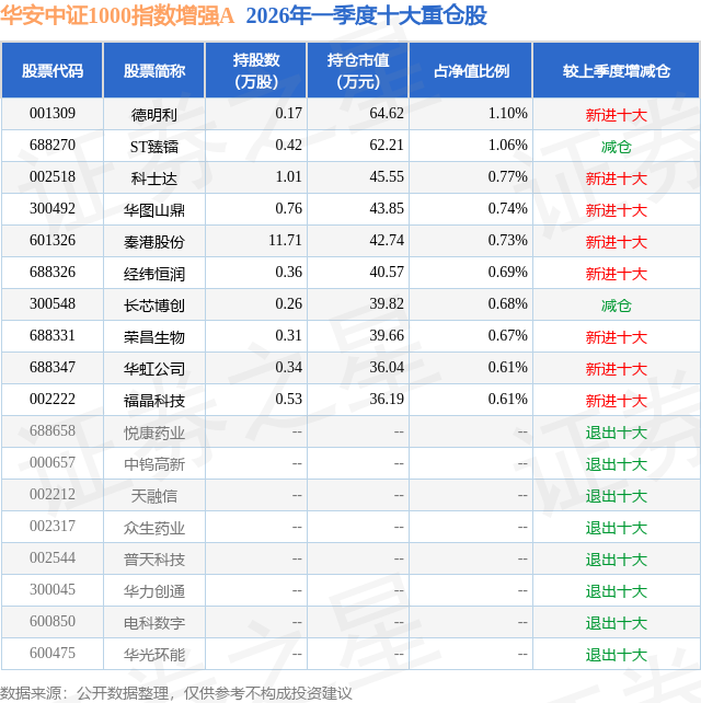 证券之星消息,日前华安中证1000指数增强A基金公布一季报,2026年一季度最新规模0.29亿元,季度净值涨幅为0.37%。