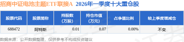 从基金规模来看,招商中证电池主题ETF联接A基金2026年一季度公布的基金规模为2.37亿元,较上一期规模3591.84万元变化了2.02亿元,环比变化了561.01%。该基金最新一期资产配置为:无股票类资产,债券占净值比2.01%,现金占净值比3.52%。从基金持仓来看,该基金当季前十大股票仓位达0.0%,第一大重仓股为阿特斯(688472),持仓占比为0.0%。