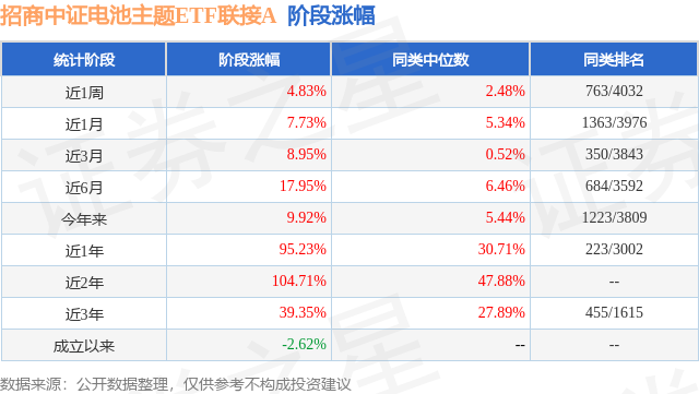 从业绩表现来看,招商中证电池主题ETF联接A基金过去一年净值涨幅为95.23%,在同类基金中排名223/3002,同类基金过去一年净值涨幅中位数为30.71%。而基金过去一年的最大回撤为-13.98%,成立以来的最大回撤为-60.1%。
