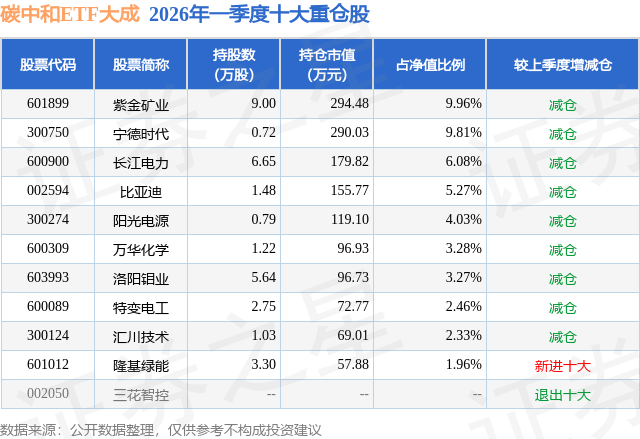 从基金规模来看,碳中和ETF大成基金2026年一季度公布的基金规模为0.3亿元,较上一期规模4729.95万元变化了-1774.27万元,环比变化了-37.51%。该基金最新一期资产配置为:股票占净值比98.5%,无债券类资产,现金占净值比1.65%。从基金持仓来看,该基金当季前十大股票仓位达48.45%,第一大重仓股为紫金矿业(601899),持仓占比为9.96%。