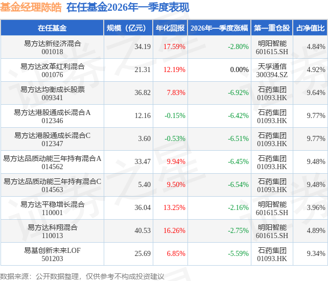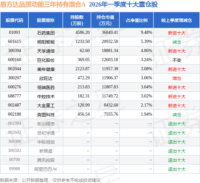从基金规模来看,易方达品质动能三年持有混合A基金2026年一季度公布的基金规模为33.47亿元,较上一期规模70.17亿元变化了-36.71亿元,环比变化了-52.31%。该基金最新一期资产配置为:股票占净值比83.58%,无债券类资产,现金占净值比16.97%。从基金持仓来看,该基金当季前十大股票仓位达39.28%,第一大重仓股为石药集团(01093),持仓占比为9.48%。