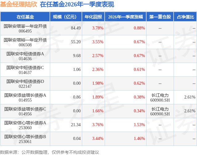 证券之星消息,日前国联安添益增长债券A基金公布一季报,2026年一季度最新规模0.86亿元,季度净值涨幅为0.38%。