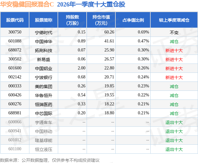 从基金规模来看,华安稳健回报混合C基金2026年一季度公布的基金规模为0.01亿元,较上一期规模35.55万元变化了27.26万元,环比变化了76.68%。该基金最新一期资产配置为:股票占净值比12.49%,债券占净值比80.88%,现金占净值比1.29%。从基金持仓来看,该基金当季前十大股票仓位达3.13%,第一大重仓股为宁德时代(300750),持仓占比为0.69%。