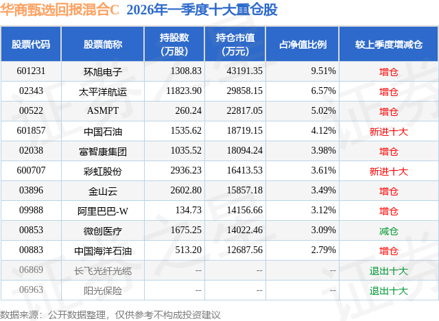 从基金规模来看,华商甄选回报混合C基金2026年一季度公布的基金规模为18.42亿元,较上一期规模20.56亿元变化了-2.14亿元,环比变化了-10.42%。该基金最新一期资产配置为:股票占净值比90.53%,无债券类资产,现金占净值比10.31%。从基金持仓来看,该基金当季前十大股票仓位达45.3%,第一大重仓股为环旭电子(601231),持仓占比为9.51%。