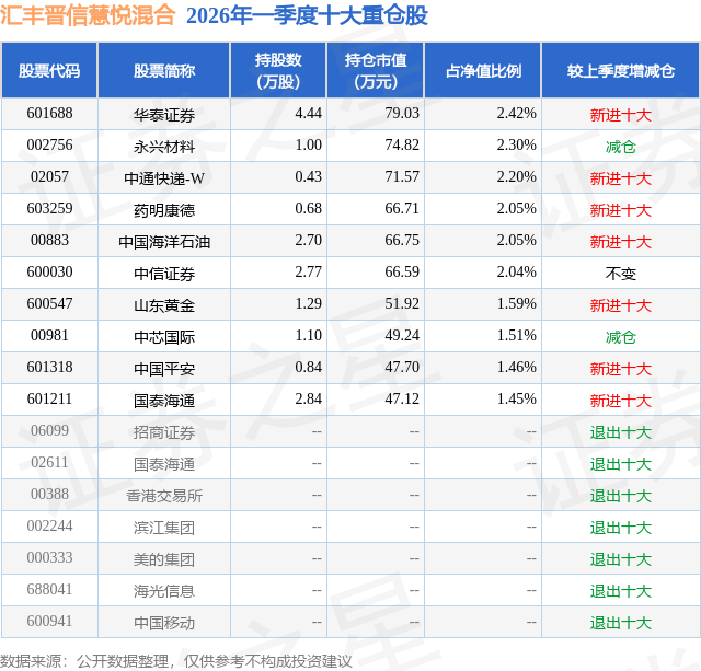 从基金规模来看,汇丰晋信慧悦混合基金2026年一季度公布的基金规模为0.33亿元,较上一期规模4494.59万元变化了-1234.71万元,环比变化了-27.47%。该基金最新一期资产配置为:股票占净值比32.56%,债券占净值比61.99%,现金占净值比5.6%。从基金持仓来看,该基金当季前十大股票仓位达19.07%,第一大重仓股为华泰证券(601688),持仓占比为2.42%。