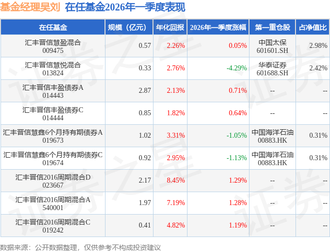 证券之星消息,日前汇丰晋信慧悦混合基金公布一季报,2026年一季度最新规模0.33亿元,季度净值涨幅为-4.29%。