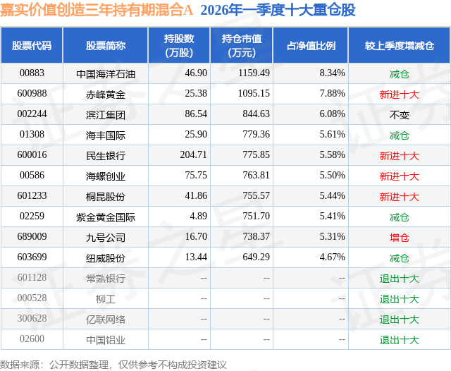 从基金规模来看,嘉实价值创造三年持有期混合A基金2026年一季度公布的基金规模为1.14亿元,较上一期规模3.22亿元变化了-2.09亿元,环比变化了-64.71%。该基金最新一期资产配置为:股票占净值比92.8%,债券占净值比5.45%,现金占净值比2.47%。从基金持仓来看,该基金当季前十大股票仓位达59.82%,第一大重仓股为中国海洋石油(00883),持仓占比为8.34%。