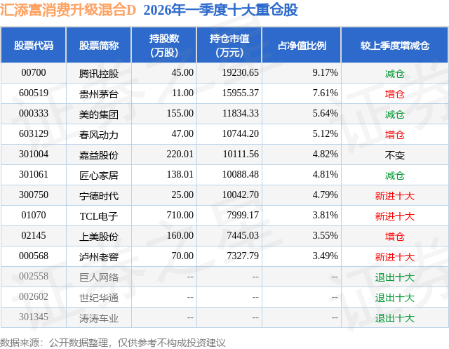 证券之星消息,日前汇添富消费升级混合D基金公布一季报,2026年一季度最新规模0.16亿元,季度净值涨幅为-12.23%。