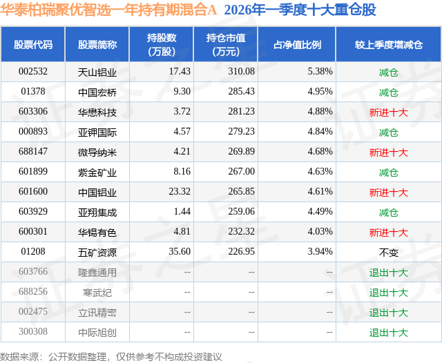从基金规模来看,华泰柏瑞聚优智选一年持有期混合A基金2026年一季度公布的基金规模为0.48亿元,较上一期规模4939.83万元变化了-147.54万元,环比变化了-2.99%。该基金最新一期资产配置为:股票占净值比92.85%,无债券类资产,现金占净值比7.22%。从基金持仓来看,该基金当季前十大股票仓位达46.43%,第一大重仓股为天山铝业(002532),持仓占比为5.38%。