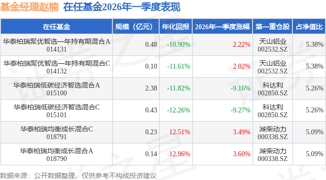 证券之星消息,日前华泰柏瑞聚优智选一年持有期混合A基金公布一季报,2026年一季度最新规模0.48亿元,季度净值涨幅为2.22%。