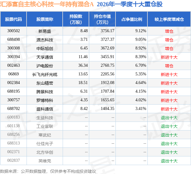 从基金规模来看,汇添富自主核心科技一年持有混合A基金2026年一季度公布的基金规模为3.19亿元,较上一期规模1.44亿元变化了1.75亿元,环比变化了121.5%。该基金最新一期资产配置为:股票占净值比91.81%,无债券类资产,现金占净值比9.34%。从基金持仓来看,该基金当季前十大股票仓位达63.75%,第一大重仓股为新易盛(300502),持仓占比为9.12%。