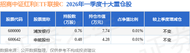 从基金规模来看,招商中证红利ETF联接C基金2026年一季度公布的基金规模为1.39亿元,较上一期规模1.19亿元变化了1976.84万元,环比变化了16.63%。该基金最新一期资产配置为:股票占净值比0.02%,债券占净值比0.92%,现金占净值比5.53%。从基金持仓来看,该基金当季前十大股票仓位达0.02%,第一大重仓股为浦发银行(600000),持仓占比为0.01%。