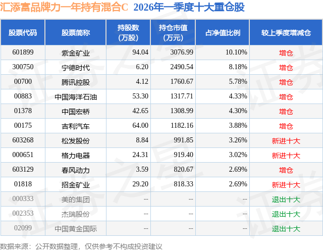 从基金规模来看,汇添富品牌力一年持有混合C基金2026年一季度公布的基金规模为0.15亿元,较上一期规模932.59万元变化了523.66万元,环比变化了56.15%。该基金最新一期资产配置为:股票占净值比74.81%,无债券类资产,现金占净值比24.26%。从基金持仓来看,该基金当季前十大股票仓位达48.23%,第一大重仓股为紫金矿业(601899),持仓占比为10.1%。