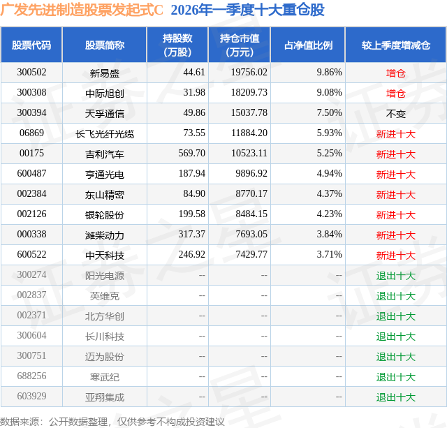 从基金规模来看,广发先进制造股票发起式C基金2026年一季度公布的基金规模为12.94亿元,较上一期规模1.66亿元变化了11.28亿元,环比变化了679.84%。该基金最新一期资产配置为:股票占净值比94.4%,无债券类资产,现金占净值比6.31%。从基金持仓来看,该基金当季前十大股票仓位达58.71%,第一大重仓股为新易盛(300502),持仓占比为9.86%。