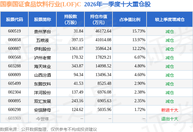 证券之星消息,日前国泰国证食品饮料行业(LOF)C基金公布一季报,2026年一季度最新规模2.24亿元,季度净值涨幅为-5.4%。