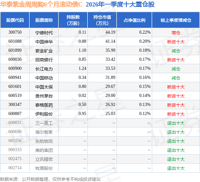 从基金规模来看,华泰紫金周周购6个月滚动债C基金2026年一季度公布的基金规模为1.49亿元,较上一期规模13.14万元变化了1.49亿元,环比变化了113073.51%。该基金最新一期资产配置为:股票占净值比5.97%,债券占净值比82.3%,现金占净值比1.15%。从基金持仓来看,该基金当季前十大股票仓位达1.64%,第一大重仓股为宁德时代(300750),持仓占比为0.22%。