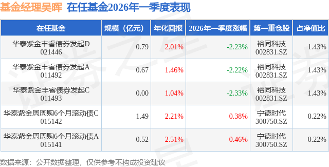 证券之星消息,日前华泰紫金周周购6个月滚动债C基金公布一季报,2026年一季度最新规模1.49亿元,季度净值涨幅为0.38%。