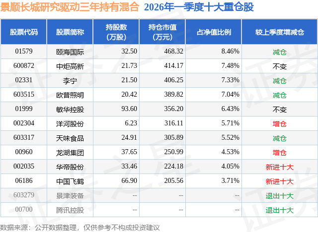 从基金规模来看,景顺长城研究驱动三年持有混合基金2026年一季度公布的基金规模为0.55亿元,较上一期规模2.63亿元变化了-2.08亿元,环比变化了-78.95%。该基金最新一期资产配置为:股票占净值比93.7%,无债券类资产,现金占净值比7.36%。从基金持仓来看,该基金当季前十大股票仓位达60.26%,第一大重仓股为颐海国际(01579),持仓占比为8.46%。