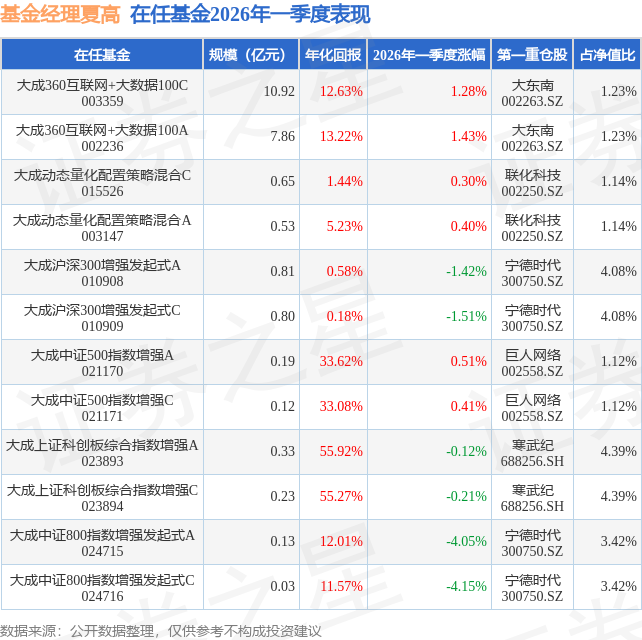 证券之星消息,日前大成动态量化配置策略混合C基金公布一季报,2026年一季度最新规模0.65亿元,季度净值涨幅为0.3%。