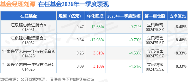 证券之星消息,日前汇泉兴至未来一年持有混合A基金公布一季报,2026年一季度最新规模0.26亿元,季度净值涨幅为-4.53%。