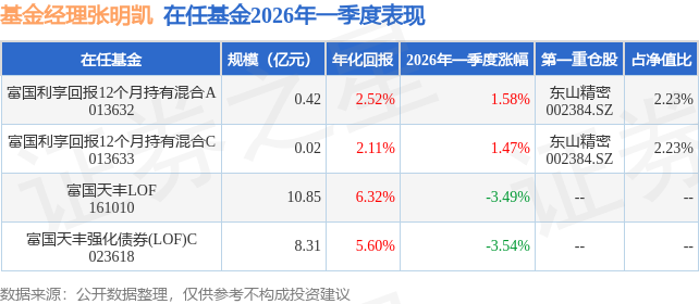 证券之星消息,日前富国利享回报12个月持有混合C基金公布一季报,2026年一季度最新规模0.02亿元,季度净值涨幅为1.47%。