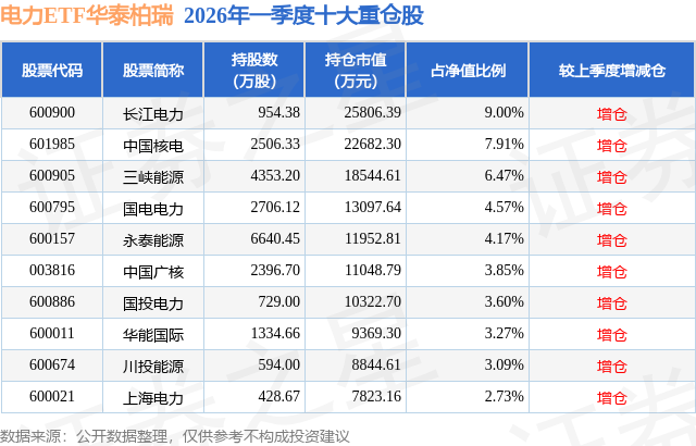 从基金规模来看,电力ETF华泰柏瑞基金2026年一季度公布的基金规模为28.66亿元,较上一期规模7.13亿元变化了21.54亿元,环比变化了302.1%。该基金最新一期资产配置为:股票占净值比99.57%,无债券类资产,现金占净值比0.55%。从基金持仓来看,该基金当季前十大股票仓位达48.66%,第一大重仓股为长江电力(600900),持仓占比为9.0%。