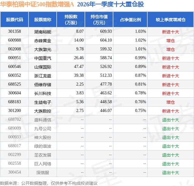 从基金规模来看,华泰柏瑞中证500指数增强A基金2026年一季度公布的基金规模为3.2亿元,较上一期规模7879.21万元变化了2.41亿元,环比变化了306.15%。该基金最新一期资产配置为:股票占净值比84.42%,无债券类资产,现金占净值比14.72%。从基金持仓来看,该基金当季前十大股票仓位达8.91%,第一大重仓股为湖南裕能(301358),持仓占比为1.03%。