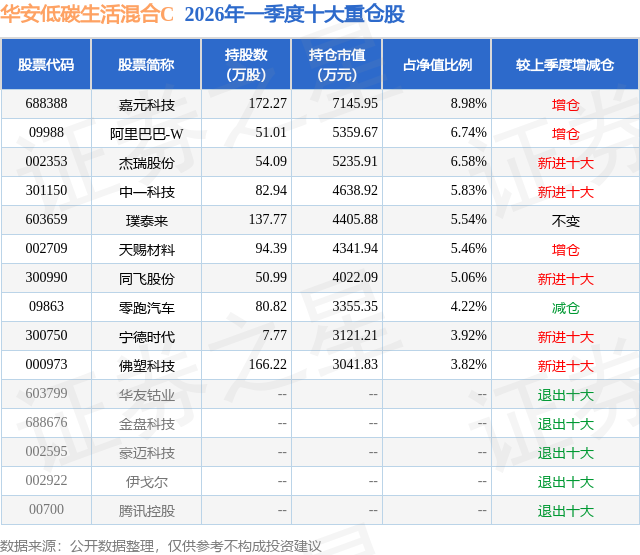 从基金规模来看,华安低碳生活混合C基金2026年一季度公布的基金规模为3.14亿元,较上一期规模4.1亿元变化了-9596.52万元,环比变化了-23.41%。该基金最新一期资产配置为:股票占净值比92.69%,无债券类资产,现金占净值比8.64%。从基金持仓来看,该基金当季前十大股票仓位达56.15%,第一大重仓股为嘉元科技(688388),持仓占比为8.98%。