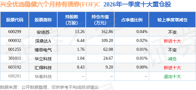 从基金规模来看,兴全优选稳健六个月持有债券(FOF)C基金2026年一季度公布的基金规模为29.53亿元,较上一期规模1.81亿元变化了27.72亿元,环比变化了1534.94%。该基金最新一期资产配置为:股票占净值比0.08%,债券占净值比5.07%,现金占净值比1.95%。从基金持仓来看,该基金当季前十大股票仓位达0.08%,第一大重仓股为安迪苏(600299),持仓占比为0.04%。