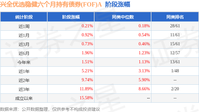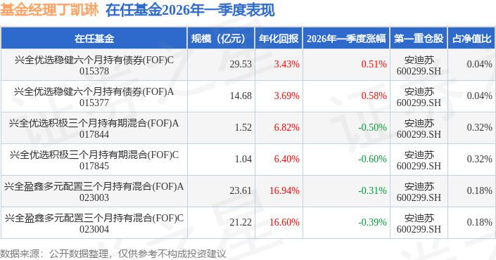 从基金规模来看,兴全优选稳健六个月持有债券(FOF)A基金2026年一季度公布的基金规模为14.68亿元,较上一期规模2.81亿元变化了11.87亿元,环比变化了422.25%。该基金最新一期资产配置为:股票占净值比0.08%,债券占净值比5.07%,现金占净值比1.95%。从基金持仓来看,该基金当季前十大股票仓位达0.08%,第一大重仓股为安迪苏(600299),持仓占比为0.04%。