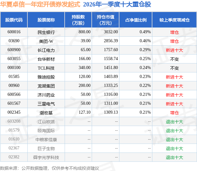 从基金规模来看,华夏卓信一年定开债券发起式基金2026年一季度公布的基金规模为61.45亿元,较上一期规模44.32亿元变化了17.13亿元,环比变化了38.64%。该基金最新一期资产配置为:股票占净值比6.72%,债券占净值比137.37%,现金占净值比1.48%。从基金持仓来看,该基金当季前十大股票仓位达2.81%,第一大重仓股为民生银行(600016),持仓占比为0.49%。