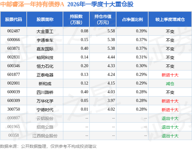 从基金规模来看,中邮睿泽一年持有债券A基金2026年一季度公布的基金规模为0.13亿元,较上一期规模1662.94万元变化了-319.03万元,环比变化了-19.18%。该基金最新一期资产配置为:股票占净值比12.27%,债券占净值比83.48%,现金占净值比1.07%。从基金持仓来看,该基金当季前十大股票仓位达3.16%,第一大重仓股为大金重工(002487),持仓占比为0.39%。
