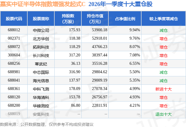 从基金规模来看,嘉实中证半导体指数增强发起式C基金2026年一季度公布的基金规模为46.02亿元,较上一期规模11.67亿元变化了34.35亿元,环比变化了294.4%。该基金最新一期资产配置为:股票占净值比94.3%,债券占净值比0.21%,现金占净值比6.23%。从基金持仓来看,该基金当季前十大股票仓位达66.38%,第一大重仓股为中微公司(688012),持仓占比为9.94%。
