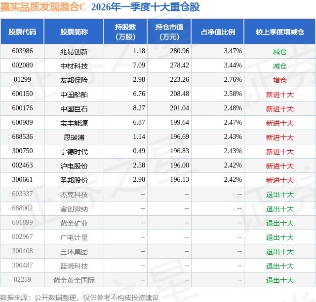 从基金规模来看,嘉实品质发现混合C基金2026年一季度公布的基金规模为0.17亿元,较上一期规模2026.94万元变化了-311.55万元,环比变化了-15.37%。该基金最新一期资产配置为:股票占净值比80.93%,债券占净值比5.75%,现金占净值比13.86%。从基金持仓来看,该基金当季前十大股票仓位达26.9%,第一大重仓股为兆易创新(603986),持仓占比为3.47%。