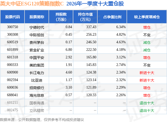 从基金规模来看,英大中证ESG120策略指数C基金2026年一季度公布的基金规模为0.01亿元,较上一期规模455.38万元变化了-322.4万元,环比变化了-70.8%。该基金最新一期资产配置为:股票占净值比93.62%,无债券类资产,现金占净值比7.33%。从基金持仓来看,该基金当季前十大股票仓位达35.04%,第一大重仓股为宁德时代(300750),持仓占比为6.34%。