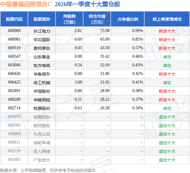 证券之星消息,日前中银景福回报混合C基金公布一季报,2026年一季度最新规模0.09亿元,季度净值涨幅为-0.14%。