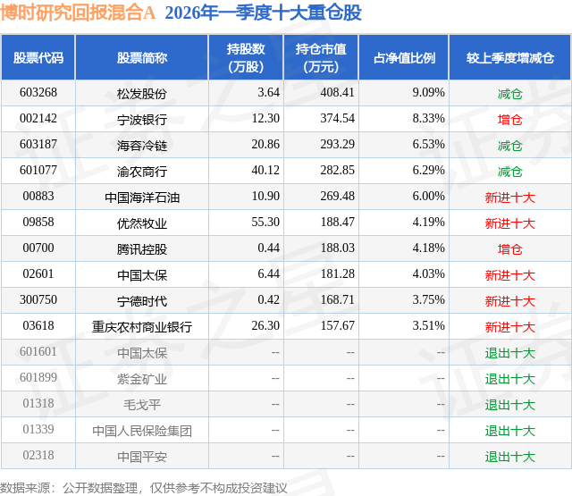 从基金规模来看,博时研究回报混合A基金2026年一季度公布的基金规模为0.12亿元,较上一期规模1470.47万元变化了-282.13万元,环比变化了-19.19%。该基金最新一期资产配置为:股票占净值比90.44%,无债券类资产,现金占净值比11.27%。从基金持仓来看,该基金当季前十大股票仓位达55.9%,第一大重仓股为松发股份(603268),持仓占比为9.09%。