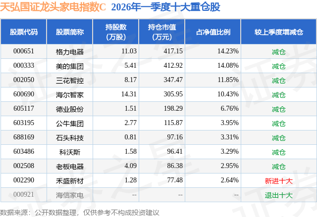 从基金规模来看,天弘国证龙头家电指数C基金2026年一季度公布的基金规模为0.2亿元,较上一期规模1.09亿元变化了-8891.57万元,环比变化了-81.68%。该基金最新一期资产配置为:股票占净值比94.68%,无债券类资产,现金占净值比6.2%。从基金持仓来看,该基金当季前十大股票仓位达73.49%,第一大重仓股为格力电器(000651),持仓占比为14.23%。