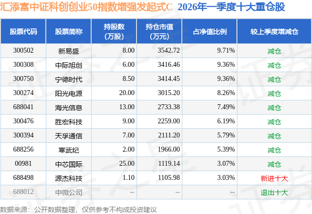从基金规模来看,汇添富中证科创创业50指数增强发起式C基金2026年一季度公布的基金规模为1.93亿元,较上一期规模9464.43万元变化了9814.78万元,环比变化了103.7%。该基金最新一期资产配置为:股票占净值比94.16%,无债券类资产,现金占净值比5.91%。从基金持仓来看,该基金当季前十大股票仓位达67.65%,第一大重仓股为新易盛(300502),持仓占比为9.71%。