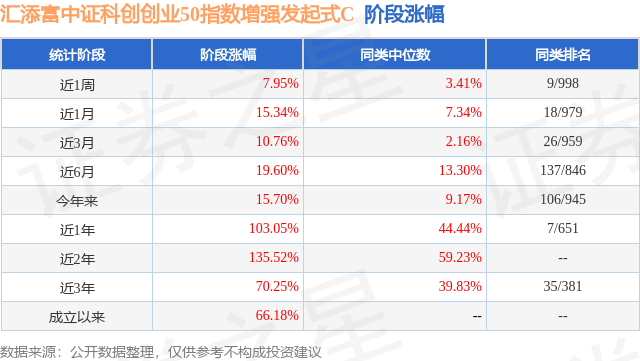 证券之星消息,日前汇添富中证科创创业50指数增强发起式C基金公布一季报,2026年一季度最新规模1.93亿元,季度净值涨幅为-5.67%。
