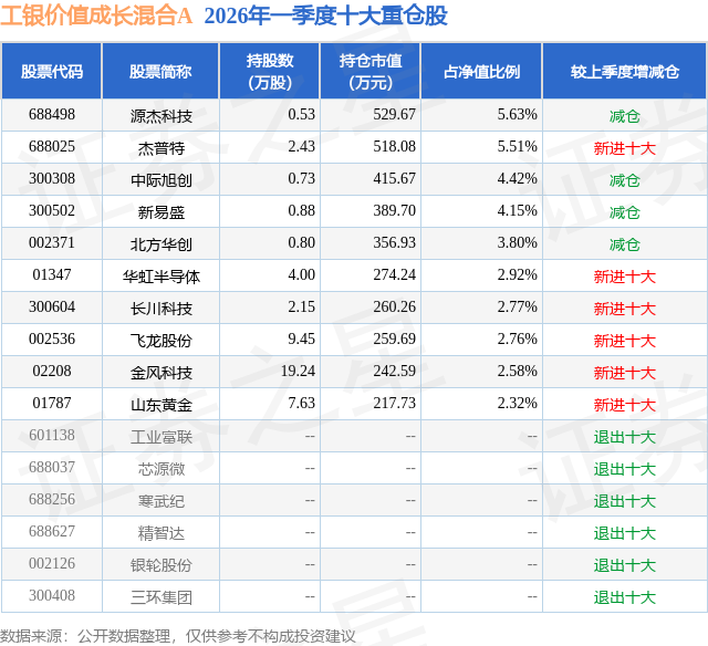 从基金规模来看,工银价值成长混合A基金2026年一季度公布的基金规模为0.8亿元,较上一期规模1.37亿元变化了-5661.5万元,环比变化了-41.42%。该基金最新一期资产配置为:股票占净值比82.27%,无债券类资产,现金占净值比18.97%。从基金持仓来看,该基金当季前十大股票仓位达36.86%,第一大重仓股为源杰科技(688498),持仓占比为5.63%。