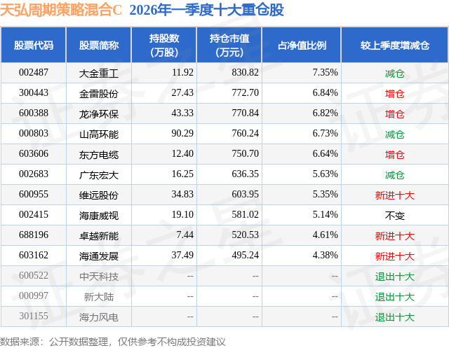 从基金规模来看,天弘周期策略混合C基金2026年一季度公布的基金规模为0.13亿元,较上一期规模1362.49万元变化了-22.39万元,环比变化了-1.64%。该基金最新一期资产配置为:股票占净值比91.74%,无债券类资产,现金占净值比9.0%。从基金持仓来看,该基金当季前十大股票仓位达59.49%,第一大重仓股为大金重工(002487),持仓占比为7.35%。