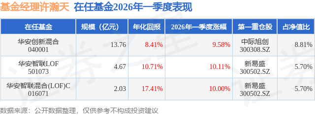 华安创新混合现任基金经理为许瀚天,本季度增聘基金经理许瀚天,近期离任的基金经理为蒋璆。其中在任基金经理许瀚天已从业0年又346天,2026年1月19日正式接手管理华安创新混合,任职期间累计回报为26.41%。目前还管理着3只基金产品(包括A类和C类),其中本季度表现最佳的基金为华安智联LOF(501073),季度净值涨幅为10.11%。