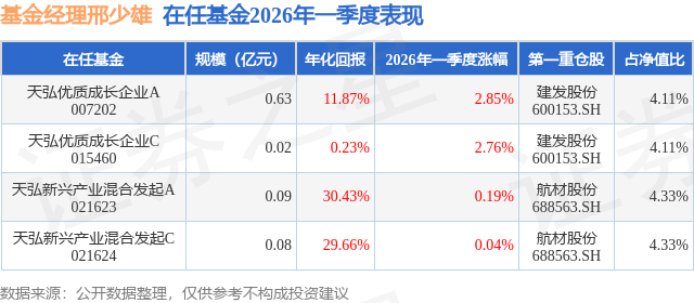 证券之星消息,日前天弘新兴产业混合发起C基金公布一季报,2026年一季度最新规模0.08亿元,季度净值涨幅为0.04%。