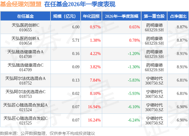 证券之星消息,日前天弘匠心臻选混合发起A基金公布一季报,2026年一季度最新规模0.07亿元,季度净值涨幅为-6.1%。